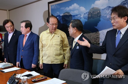 | △ 황우여, 메르스 발생지역 시도교육감 대책회의 주재 (서울=연합뉴스) 전수영 기자 = 황우여(가운데) 사회부총리 겸 교육부 장관과 이재정 경기도교육감 등 메르스 발생지역 시도교육감들이 3일 오전 정부서울청사에서 대책회의를 하고 있다. 왼쪽부터 김병우 충북교육감, 김지철 충남교육감, 황우여 부총리, 이재정, 조희연 서울시교육감. |
