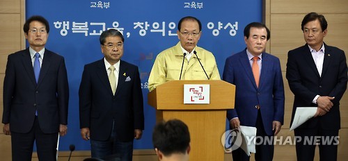 | △ 교육부총리와 시도교육감 메르스 대책 브리핑 (서울=연합뉴스) 전수영 기자 = 서울·경기·충남·충북 교육감과 중동호흡기증후군(메르스) 확산 방지대책을 논의한 황우여 사회부총리 겸 교육부 장관이 3일 오전 정부서울청사에서 회의결과를 브리핑하고 있다. 왼쪽부터 조희연 서울시교육감, 이재정 경기도교육감, 황 장관, 김지철 충남교육감, 김병우 충북교육감. 황 장관은 이날 "메르스 감염 예방을 위해 현재 209개교가 휴업 또는 휴교조치를 한 상태"라고 밝혔다. |