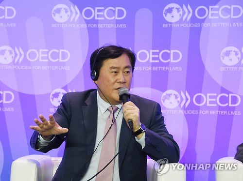 | △ OECD 각료이사회 참석한 최경환 부총리 (서울=연합뉴스) 최경환 부총리 겸 기획재정부 장관이 3일 프랑스 파리 OECD에서 열린 '2015년 OECD(경제협력개발기구) 각료이사회'에 참석, '투자활성화를 위한 구조개혁' 패널토론에서 'OECD의 국제금융시장 안정 차원에서의 리더쉽 발휘'를 강조하고 있다. << 기획재정부 >> |