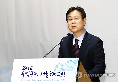 | △ 이관섭 차관, 2015 무역구제 서울국제포럼 축사 (서울=연합뉴스) 이관섭 산업통상자원부 제1차관이 4일 오전 서울 중구 대한상공회의소에서 열린 '2015 무역구제 서울국제포럼'에 참석, 축사를 하고 있다. (산업통상자원부 제공) |