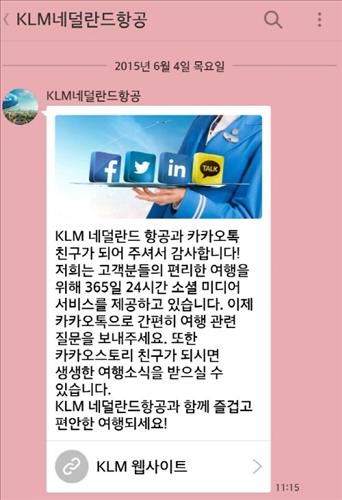페이스북과 트위터 등 소셜미디어서비스(SNS)를 적극적으로 활용해온 네덜란드항공은 항공사 가운데 처음으로 카카오톡으로 365일, 24시간 고객 응대 서비스를 제공한다.