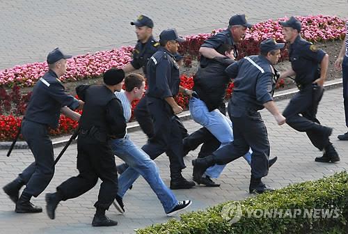 | △ 벨라루스에서 소셜네트워크를 통한 혁명이라는 구호를 내세우고 시위를 하던 시민들이 경찰에 연행되고 있다.(AP=연합뉴스 자료사진) |