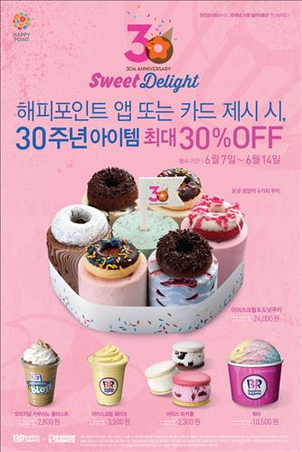 비알코리아는 30주년을 기념해 배스킨라빈스와 던킨도너츠에서 해피포인트 애플리케이션(앱) 또는 카드를 제시하는 고객을 대상으로 할인 행사를 한다.