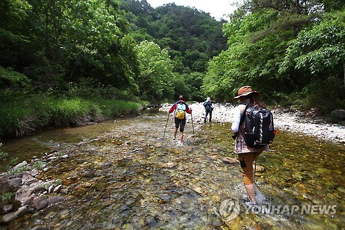 | △ (인제=연합뉴스) 성연재 기자 = 사람들이 거의 알지 못하는 '오지 중에 오지' 강원도 인제의 아침가리 트레킹 길은 물길을 따라 걸을 수 밖에 없다. 2015.6.5 2013399@yna.co.kr |