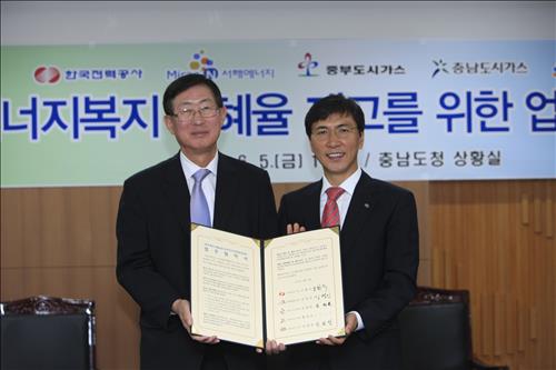 (서울=연합뉴스) 이웅 기자 = 한국전력[015760]이 5일 충청남도와 '에너지복지 수혜율 제고 및 복지사각지대 해소를 위한 업무협약'을 맺었다고 밝혔다.