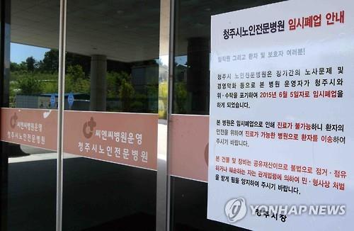 | △ 지난 5일 임시 폐업된 청주시노인전문병원 현관에 폐업 소식을 알리는 안내판이 설치돼 있다. <연합뉴스DB>> |