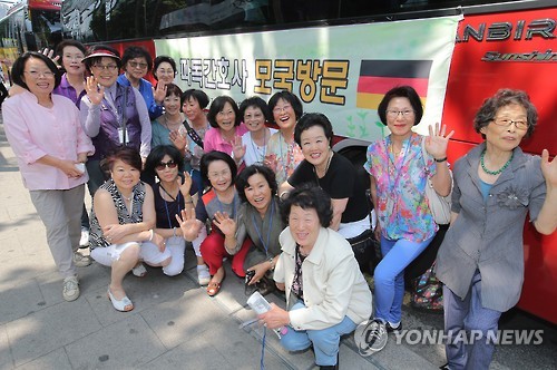 | △ 고국 여행길 오르는 파독 간호사들 (서울=연합뉴스) 이정훈 기자 = 백발이 성성한 모습을 고국을 찾은 파독 간호사들이 7일 오후 서울 서초구 양재동 서초구민회관 앞에서 안동으로 출발하기 전 기념촬영을 하고 있다. 재유럽한인간호사협회는 독일을 비롯한 유럽 곳곳에 흩어져 살고 있는 파독 간호사 출신 27명이 최근 입국해 이날부터 12일까지 5박6일 일정으로 고국 여행을 한다고 밝혔다. 2015.6.7 uwg806@yna.co.kr |