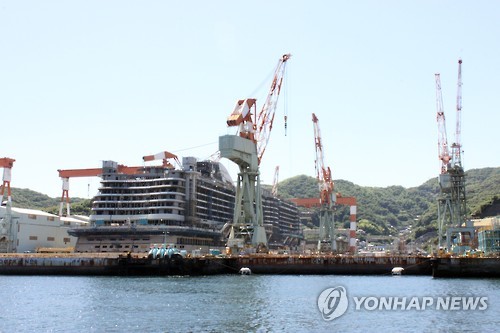 | △ 조선인 징용현장 나가사키 조선소 (나가사키=연합뉴스) 이세원 특파원 = 4일 일본 나가사키(長崎)시 소재 미쓰비시(三菱)중공업 나가사키 조선소에서 대형 크루즈가 건조 중인 모습이 보인다. 나가사키 조선소는 일제 강점기에 조선인이 강제 노역을 한 현장이다. 나가사키 만에서 운행 중인 배에서 바라본 모습. sewonlee@yna.co.kr |