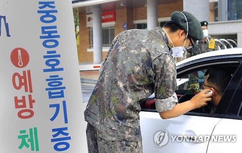 | △ 군 부대서 발열 검사 (임실=연합뉴스) 전북 임실에 있는 육군 35사단 의무장병이 5일 오전 메르스 예방을 위해 위병소에서 출근 장병과 출입 민간인을 대상으로 발열 검사를 하고 있다. 부대는 24시간 체온체크 중이다. 2015.6.5 kan@yna.co.kr |
