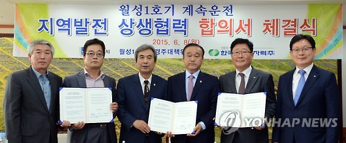 한국수력원자력과 경주시, 월성원전 1호기 동경주대책위원회는 8일 경주시청에서 월성 1호기 계속 운전과 관련한 지역상생방안을 담은 3자 합의안에 공동 서명했다.