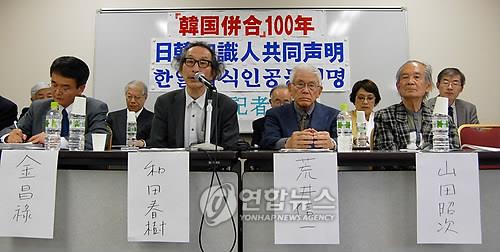 | △ 와다 하루키 도쿄대 명예교수(검은색 뿔테안경) 등 일본 지식인들이 2010년 5월 10일 일본 도쿄 지요다구에 있는 일본교육회관 8층 제3회의실에서 한일 지식인 공동선언 기자회견을 열고 있다.(연합뉴스 자료사진) |