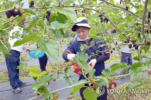 | △ 메르스 발생 마을 오디 따주는 공무원들 (순창=연합뉴스) 전북 순창군청 공무원들이 8일 중동호흡기증후군(메르스) 환자가 발생해 수확을 하지 못하고 있는 A 마을 주민의 밭에서 오디를 대신 따주는 봉사활동을 하고 있다. 2015.6.8 <<순창군>> doin100@yna.co.kr |