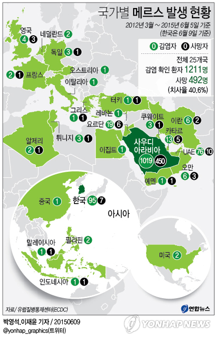 지난달 31일 기준 유럽질병통제센터(ECDC)의 통계를 보면 메르스 사망자 수는 사우디가 450명으로 가장 많고, 아랍에미리트(UAE)가 10명이다.