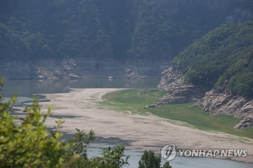 | △ '모래사장 아닙니다' 바닥 드러낸 충주호 (단양=연합뉴스) 공병설 기자 = 가뭄이 계속되는 가운데 7일 충북 단양군 단성면 장회나루 부근 충주호 상류지역이 군데군데 바닥을 드러내고 있다. 2015.6.7 kong@yna.co.kr |