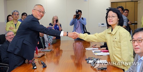 | △ 악수하는 후쿠다 게이지 WHO 사무차장과 장옥주 보건복지차관 (세종=연합뉴스) 배재만 기자 = 메르스 합동 조사를 위해 입국한 후쿠다 게이지 WHO 사무차장이 9일 오전 정부세종청사 보건복지부를 방문, 장옥주 보건복지부 차관과 악수하고 있다. |