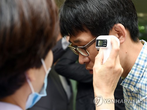 | △ 출근길 발열 측정하는 경기교육청 직원들 (수원=연합뉴스) 9일 오전 경기도 수원시 장안구 조원동 경기도교육청 남부청사 현관에서 출근하는 직원들이 중동호흡기증후군(메르스) 감염 확산 예방 대책으로 발열 측정을 하고 있다. 이날 현재 경기도에서는 절반에 가까운 1천645개 유치원과 학교가 휴업했다. 2015.6.9 <<경기도교육청>> ktkim@yna.co.kr |