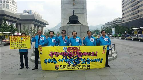 | △ 9일 오전 서울 광화문광장의 이순신 동상 앞에서 '민리민안(民利民安) 국민연합 해외동포협의회' 회원들이 메르스 사태와 관련 국민격려 퍼포먼스를 열었다. |