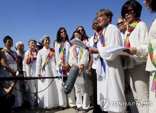 | △ International women activists read a peace declaration at Panmungak, the main North Korean building overlooking the dividing line between North and South Korea, Sunday, May 24, 2015. The Panmungak is in the Demilitarized Zone between North and South Korea, otherwise known as the DMZ. (AP Photo/Kim Kwang Hyon) |