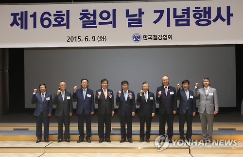 | △ '철의 날' 기념식 (서울=연합뉴스) 서명곤 기자 = 9일 오후 서울 강남구 역삼동 포스코센터에서 열린 제15회 '철의 날' 기념식에서 윤상직 산업통상자원부 장관을 비롯한 참석자들이 기념촬영을 하고 있다. 왼쪽부터 이승휘 세아베스틸 부회장, 송봉락 TCC동양 회장, 오일환 철강협회 부회장, 권오준 포스코 회장, 윤상직 산업통상자원부 장관, 이순형 세아제강 회장, 우유철 현대제철 부회장, 홍영철 고려제강 회장, 장세욱 동국제강 부회장. 철강업계는 철강업의 중요성을 인식시키고 업계의 화합을 높이기 위해 2000년부터 6월9일을 철의날로 지정, 매년 기념식을 개최해 왔다. |
