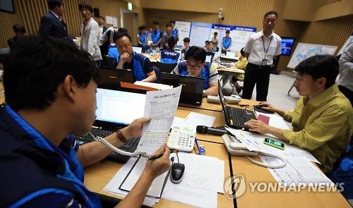 | △ 분주한 서울시 메르스 상황실 (서울=연합뉴스) 홍해인 기자 = 중동호흡기증후군(메르스) 누적 확진자가 세자릿수에 육박한 9일 오후 서울 태평로 시청에 마련된 서울시 메르스 방역대책본부 상황실에서 직원들이 전화 통화를 하는 등 분주히 업무를 보고 있다. |