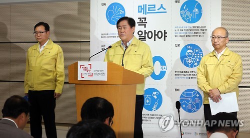 | △ 대국민 당부의 말하는 최경환 총리대행 (세종=연합뉴스) 배재만 기자 = 최경환 국무총리 직무대행이 10일 오전 정부세종청사 보건복지부 공용브리핑룸에서 중동호흡기증후군(MERS·메르스) 관련 대국민 당부의 말을 발표하고 있다. 오른쪽은 문형표 보건복지부 장관, 왼쪽은 정재근 행정자치부 차관. |