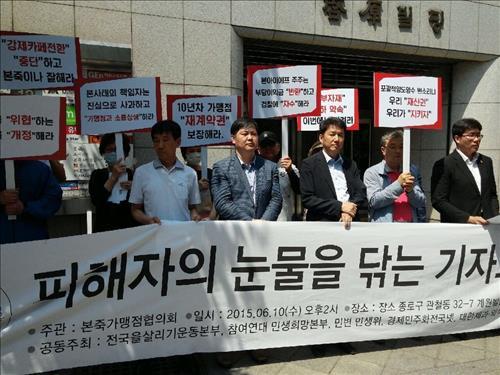 (서울=연합뉴스) 이도연 기자 = 본죽 가맹점주들이 10일 오후 서울 종로구 소재 본죽 본사인 ㈜ 본아이에프 앞에서 기자회견을 열고 "본아이에프의 불공정거래행위를 공정거래위원회에 신고한다"고 밝혔다.
