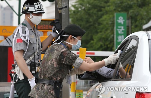 | △ 서울 용산구 국방부에서 헌병이 메르스 군내 유입을 차단하기 위해 출입자들을 대상으로 체열측정을 하고 있다. |