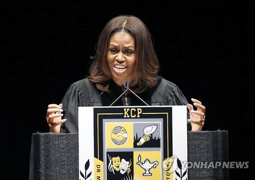 (서울=연합뉴스) 이윤영 기자 = 미국 최초의 흑인 영부인인 미셸 오바마 여사가 9일(현지시간) 자신의 고향 마을을 찾아 고교 졸업생들에게 인종차별을 딛고 일어서라는 강렬한 메시지를 던졌다.