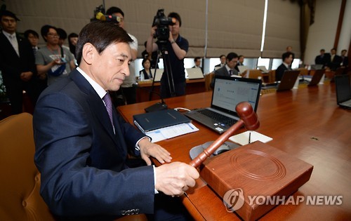 | △ 의사봉 두드리는 이주열 한국은행 총재 (서울=연합뉴스) 박지호 기자 = 이주열 한국은행 총재가 11일 오전 서울 소공동 한국은행본점에서 열린 금융통화위원회 회의에서 의사봉을 두드리고 있다. |