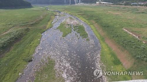 충주호 상류의 물줄기는 오랜 가뭄으로 유입량이 줄면서 동네 실개천으로 변해버렸다.