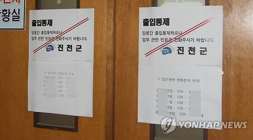 | △ 출입통제한 진천군청 (진천=연합뉴스) 변우열 기자 = 충북 진천군은 10일 중동호흡기증후군(메르스) 의심 증세를 보이는 공무원이 근무한 부서 직원들을 모두 격리조치하고 해당 사무실의 출입을 통제하고 있다. 2015.6.10 bwy@yna.co.kr |