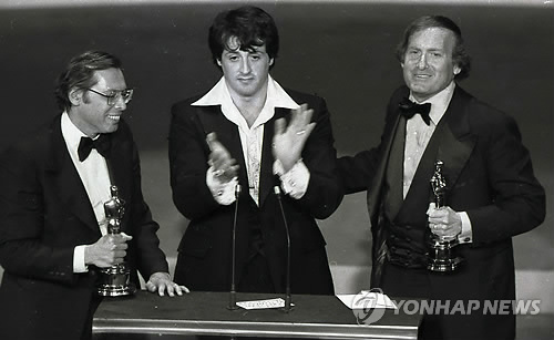 | △ 영화 '록키' 공동제작자 로버트 차토프 사망 (샌타모니카<미 캘리포니아> AP=연합뉴스) 영화 '록키'와 '성난 황소'(또는 분노의 주먹)의 제작자로 유명한 로버트 차토프가 10일(현지시각) 미국 캘리포니아 주 샌타모니카의 자택에서 별세했다. 향년 81세로 말년에 췌장암을 앓았다. 사진은 1977년 1월 30일 제34회 골든 글로브 상을 받은 로버트 차토프(오른쪽), 록키 공동제작자 어윈 윙클러(왼쪽). 가운데는 록키 주연 배우 실베스터 스탤론. |