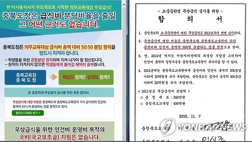 (청주=연합뉴스) 윤우용·심규석 기자 = 무상급식비 분담률을 놓고 충북도와 치열한 샅바싸움을 벌이는 충북도교육청이 홈페이지를 통해 2010년 11월 당시 이시종 지사와 이기용 교육감이 서명한 무상급식 합의서를 전격 공개했다.