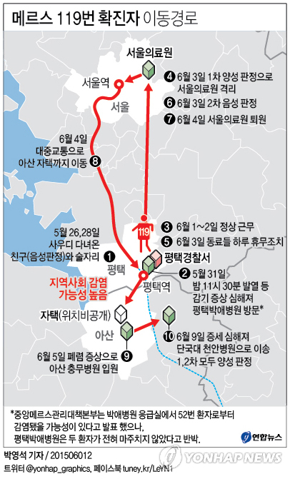(서울=연합뉴스) 하채림 기자 = 경기도 평택경찰서의 경찰관이 11일 중동호흡기증후군(메르스)으로 최종 확진되기까지 검사결과가 음·양성을 오가면서 입퇴원을 반복, 이 환자로부터 감염된 추가 환자가 나올지 우려된다.