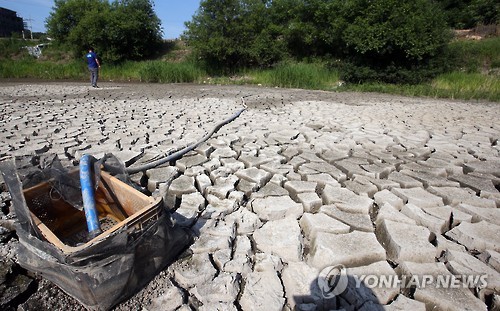 | △ 최근 유례없는 가뭄으로 피해가 잇따르는 가운데 강원 춘천시 동면의 한 저수지의 물이 아예 사라져 바닥이 거북이 등처럼 쩍쩍 갈라져 있다. |