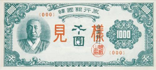 최초의 한국은행권은 1천원과 100원권 등 2종류였다. 전쟁 중이던 당시 상황이 워낙 급박한 탓에 1천원권의 도안소재로 주일 대표부에 걸려 있던 이승만 대통령 초상화를 사용했다. 100원권엔 주일 대표부가 갖고 있던 책자에 수록된 광화문 사진이 들어갔다.