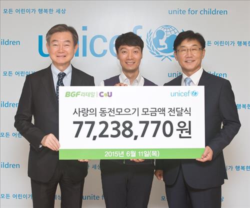 (서울=연합뉴스) 이유미 기자 = BGF리테일이 운영하는 편의점 씨유(CU)는 12일 전국 8천700여개 점포에서 고객과 가맹점주가 기부한 '사랑의 동전' 7천723만8천770원을 유니세프한국위원회에 전달했다고 밝혔다.