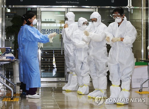 | △ 방역복 입는 군 의료 지원단 (대전=연합뉴스) 이재림 기자 = 12일 대전 서구 대청병원에서 군의관과 간호장교가 방역복을 입고 있다. 국방부는 대전시의 요청으로 중동호흡기증후군(메르스) 환자가 발생한 대청병원에서 진료 활동을 펼칠 의료 인력을 파견했다. 2015.6.12 walden@yna.co.kr |