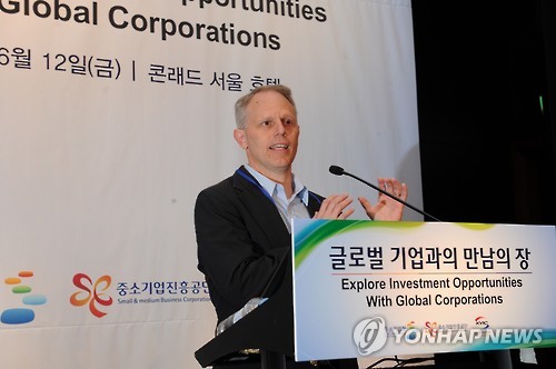 | △ '글로벌 기업과의 만남의 장' 행사서 발표하는 인텔 이사 (서울=연합뉴스) 빅터 웨스터린드(Victor Westerlind) 인텔 이사가 12일 서울 영등포구 콘래드 서울호텔에서 열린 '2015년 글로벌 기업과의 만남의 장' 행사에서 발표를 하고 있다. (중소기업청 제공) |