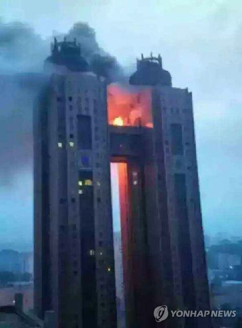 | △ 북한을 방문하는 외국인들이 주로 머무는 평양 고려호텔의 화재 장면. 6월 11일 호텔의 두 건물을 연결하는 43층 브리지에서 검은 연기와 불길이 치솟고 있다. 2015.6.12 << BBS 불교방송 제공 >> |