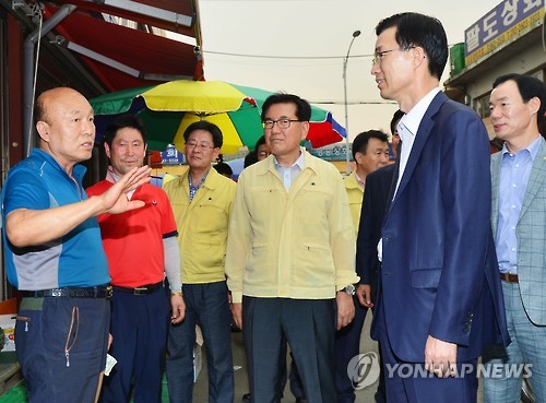 | △ 메르스 여파 재래시장 방문한 방문규 차관 (서울=연합뉴스) 방문규 기획재정부 제2차관(오른쪽 두번째)이 13일 서울시 동대문구 청량리 전통시장을 방문해 메르스 여파로 인한 상인들의 에로청취 및 시장 상황 등을 점검하고 있다. 2015.6.13 << 기획재정부 제공 >> photo@yna.co.kr |