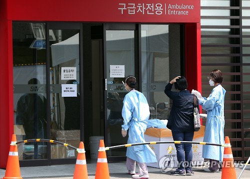 | △ 응급실 찾은 환자 (서울=연합뉴스) 홍해인 기자 = 12일 서울 일원동 삼성서울병원 응급실 앞에서 의료진이 중동호흡기증후군(메르스) 선별진료를 하며 오가고 있다. 2015.6.12 hihong@yna.co.kr |