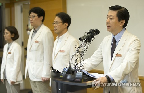 | △ 발언하는 송재훈 병원장 (서울=연합뉴스) 윤동진 기자 = 14일 오전 서울 강남구 서울삼성병원 암병원에서 열린 기자회견에서 송재훈 삼성서울병원 병원장이 중동호흡기증후군(메르스)과 관련된 병원 방침을 말하고 있다. 송 원장은 이날 기자회견에서 "이날부터 신규 외래·입원 환자를 한시적으로 제한하며 응급수술을 제외하고는 수술과 응급진료도 한시 중단한다"고 밝혔다. 2015.6.14 mon@yna.co.kr |
