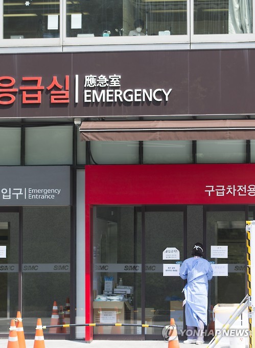 | △ 삼성서울병원, 병원 부분 폐쇄 (서울=연합뉴스) 윤동진 기자 = 14일 오전 서울 강남구 삼성서울병원 응급실 건물에서 병원 관계자들이 업무를 보고 있다. 이날 삼성서울병원에서 열린 기자회견에서 송재훈 병원장은 "이날부터 신규 외래·입원 환자를 한시적으로 제한하며 응급수술을 제외하고는 수술과 응급진료도 한시 중단한다"고 밝혔다. 2015.6.14 mon@yna.co.kr |