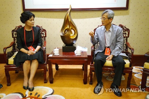 | △ 대담하는 한·중 문학인 최원식-티에닝 (베이징=연합뉴스) 한혜원 기자 = 최원식 문학평론가(오른쪽)와 티에닝(鐵凝) 중국작가협회 주석이 14일(현지시간) 중국 베이징 국제호텔에서 대담하고 있다. 두 사람은 이곳에서 열리는 제3회 동아시아문학포럼의 한국·중국 조직위원장을 맡았다. 2015.6.14 jjaeck9@yna.co.kr |