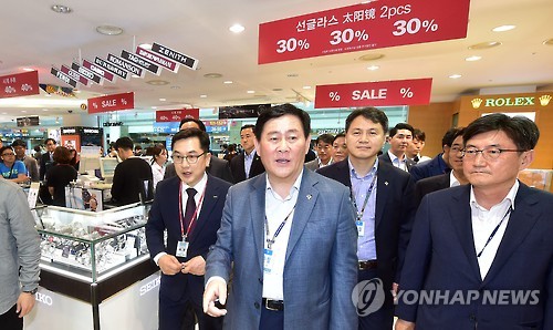 | △ 면세구역 점검하는 최경환 총리 대행 (영종도=연합뉴스) 홍해인 기자 = 최경환 국무총리 직무대행 겸 기획재정부장관이 중동호흡기증후군(메르스) 점검을 위해 14일 오후 인천국제공항을 방문, 면세 구역을 살펴보고 있다. 2015.6.14 hihong@yna.co.kr |