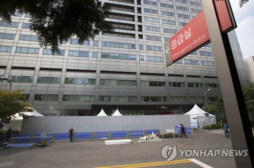 | △ 삼성서울병원, 응급실 입구 펜스 설치 (서울=연합뉴스) 윤동진 기자 = 14일 오후 서울 강남구 삼성서울병원 응급실 건물 앞에서 병원 관계자들이 펜스를 설치하고 있다. 이날 삼성서울병원에서 열린 기자회견에서 송재훈 병원장은 "이날부터 신규 외래·입원 환자를 한시적으로 제한하며 응급수술을 제외하고는 수술과 응급진료도 한시 중단한다"고 밝혔다. 2015.6.14 mon@yna.co.kr |