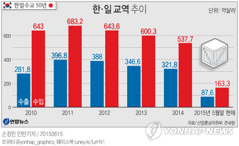 양국 교역도 갈수록 위축되고 있다. 한일 교역액은 2011년 역대 최대인 1천80억달러를 기록한 후 올해까지 4년째 감소세를 보이고 있다.