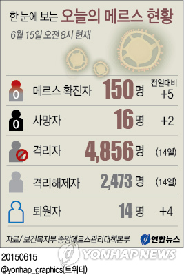 (서울=연합뉴스) 김태균 기자 = 중동호흡기증후군(메르스) 확진자가 5명 늘어 메르스 환자가 총 150명으로 집계됐다고 보건복지부가 15일 밝혔다.