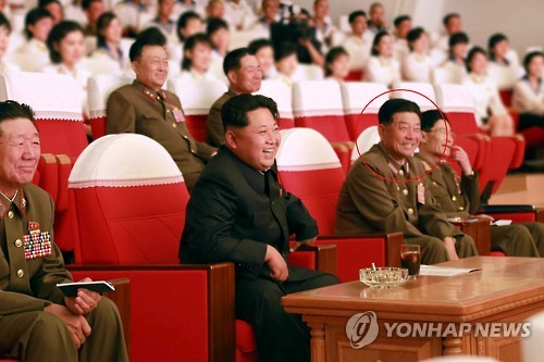 | △ 박영식, 북한 군 서열 '2위' 확인…인민무력부장 임명된 듯 (서울=연합뉴스) 노동신문은 김정은 국방위원회 제1위원장이 군부대 예술선전대 공연을 관람했다고 15일 보도했다. 노동신문은 이날 김정은 제1위원장 수행 명단에서 인민군 박영식 대장을 황병서 군 총정치국장 다음으로 호명했다. 이는 박영식 대장이 군부 서열 '2위'임을 확인한 것으로 그가 숙청된 현영철의 후임으로 인민무력부장(국방장관)에 임명됐을 가능성에 더욱 무게가 실리고 있다. 사진에서 박영식 대장(빨간 원)은 김정은 제1위원장의 바로 오른편에 앉아있다. 2015.6.15 nkphoto@yna.co.kr |